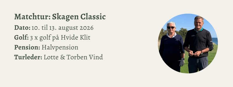 Oplevelsen indeholder 3 overnatninger, 3 runder intens golfturnering, dejlige middage og ikke mindst socialt samvær, fornemt ledet af vores rutinerede matchledere Lotte og Torben Vind.