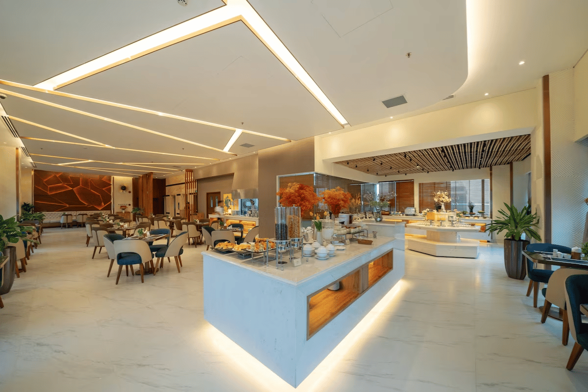 Northern Charm Hotel har en dejlig lys morgenmadsrestaurant, Panorama, beliggende på 16. etage. Her serverer de hver morgen den inkluderede morgenmadsbuffet, med et stort udvalg af klassiske internationale retter samt vietnamesiske og regionale specialiteter - her er med andre ord noget for enhver smag, om man er til frisk frugt, yoghurt, brød, kage samt æg på alle måder.