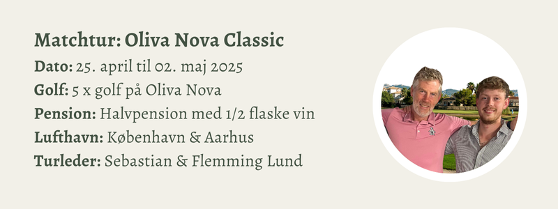 Vi spiller i løbet af ugen 5 runder golf på resortets egen bane af selv samme navn, Oliva Nova Golf. Banen åbnede sine døre i 1995 og er designet af Seve Ballesteros. Fra hotellet til golfklubben er der 6-8 min. gang, men hotellet tilbyder også en gratis shuttle service mellem golfklubben og hotellet.