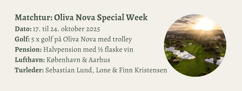 Vi spiller i løbet af ugen 5 runder golf på resortets egen bane af selv samme navn, Oliva Nova Golf. Banen åbnede sine døre i 1995 og er designet af Seve Ballesteros. Fra hotellet til golfklubben er der 6-8 min. gang, men hotellet tilbyder også en gratis shuttle service mellem golfklubben og hotellet.